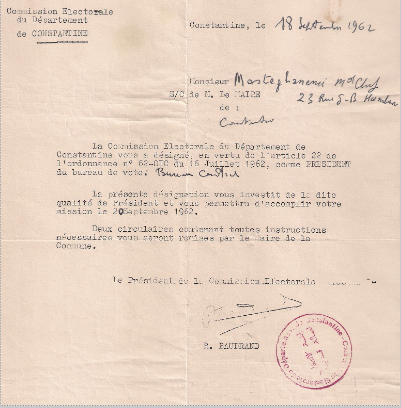 1962 كان عليه أن يصل إلى قسنطينة على عجل، و تم تعيينه رئيسا لمركز الاقتراع المركزي