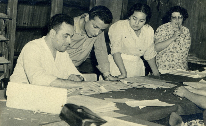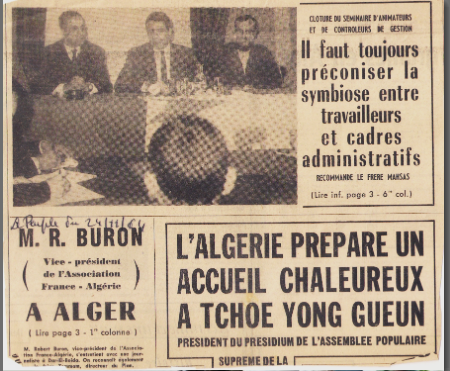 في الصورة الملتقطة عام 1964، يجلس محمد شريف، على اليسار, في الوسط، وزير الزراعة والإصلاح الزراعي. يُغطي العلم الجزائري الطاولة