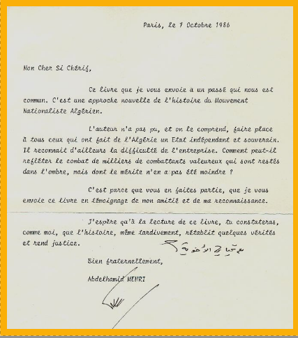 محتوى الرسالة (مترجمة من الفرنسية إلى العربية) التي أرسلها السيد عبد الحميد مهري إلى شريف مستغانمي رفقة الكتاب
