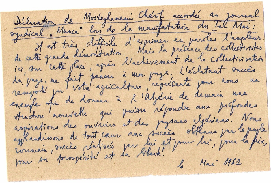 قام الصحفي الذي أجرى المقابلة مع السيد مستغانمي في صحيفة الاتحاد الرومانية بنسخ محتوى المقابلة على ورقة باللغة الفرنسية.