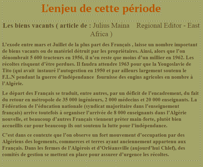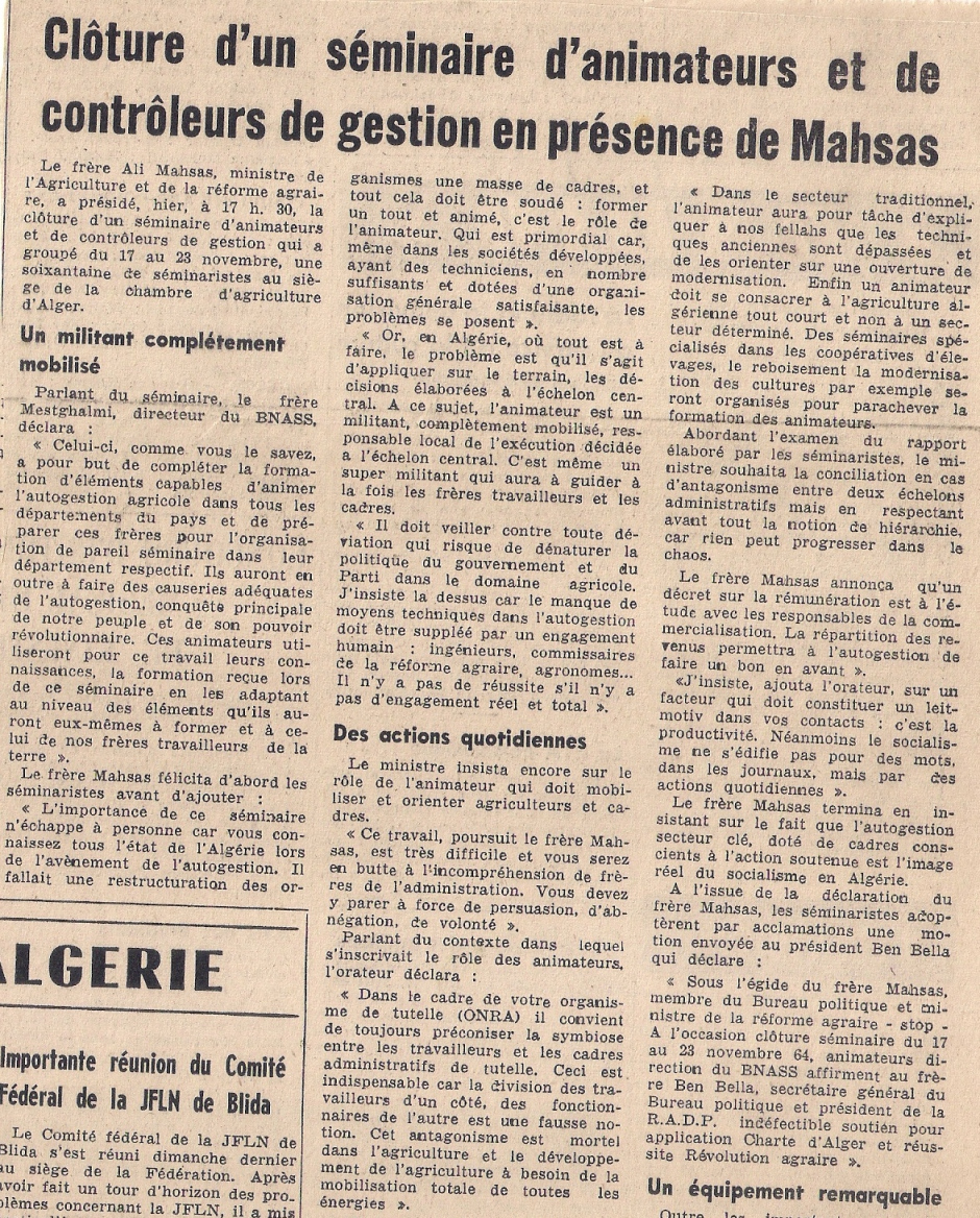 الوضع سنة بعد الاستقلال( 1963) غير مستقر سياسيا ويوحي كذلك باضطرابات لكون المحاصيل الزراعية لم تكن في موعدها بعد ما قام المستوطنون الفرنسيون قبل مغادرتهم الجزائر بعمليات تخريب