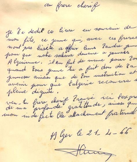 بعد صدور كتابه بعنوان " رسالة إلى الجنة «متألما لفقدان ابنه أبو بكر في حرب الرمال بين الجزائر و المغرب 62/63 (والمؤلم أن أبو بكر كان أشهر قبل وفاته يحارب فرنسا ولما اخترق الجيش المغربي الحدود الجزائرية ذهب للدفاع عن الوطن .) قام بهداية كتابه إلى صديقه محمد الشريف وبالمناسبة كتب له ما يلي :