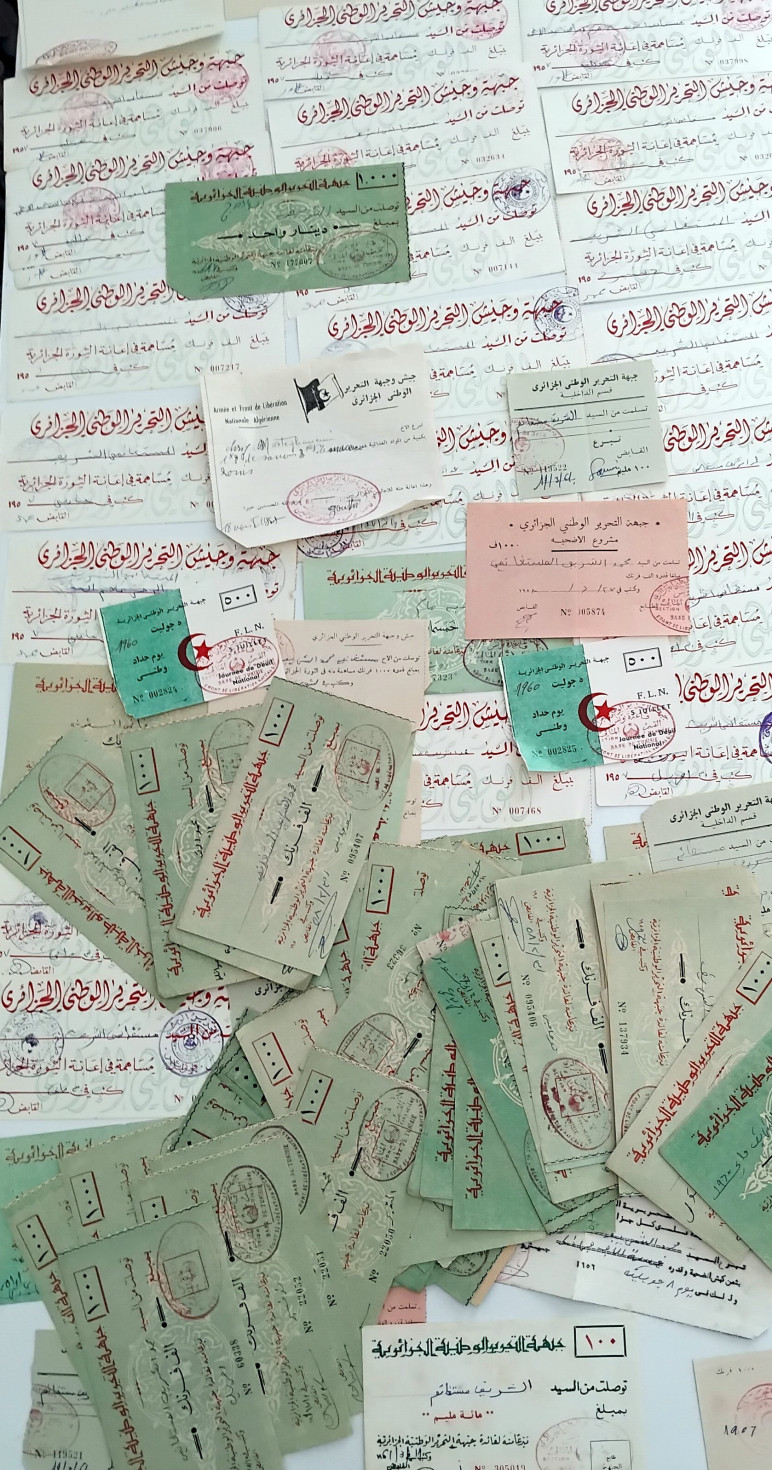 شراء الأسلحة والتبرع بها لصالح جيش التحرير الوطني وكذلك أسماء القادة العسكريين والسياسيين الذين حصلوا على الأسلحة