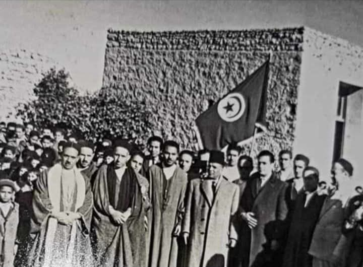 في الصورة، رئيس حزب الدستور، السيد بورقيبة (قبل أن يصبح رئيسًا للجمهورية)، ومعه السيد مستغانمي يرتدي معطفًا. ويظهر في الصورة أحد أعيان المدينة: الحاج زهيوا.